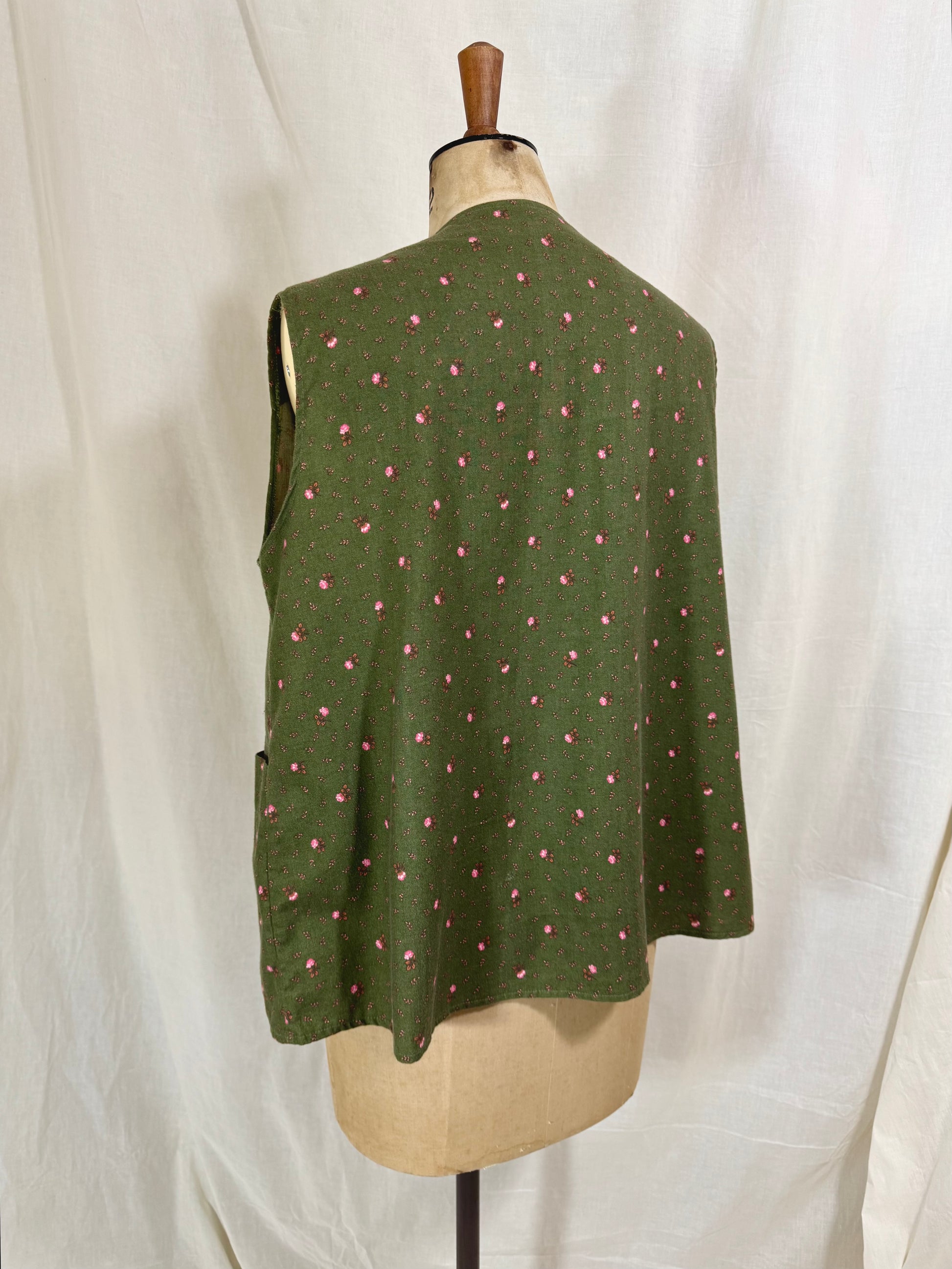 Made from the softest brushed cotton, printed in forest green with bright little pink rosebuds. Round neck, gathered shoulders, open front, huge front flat pockets reminiscent of the old Cornish smocks, perfect for creatives.