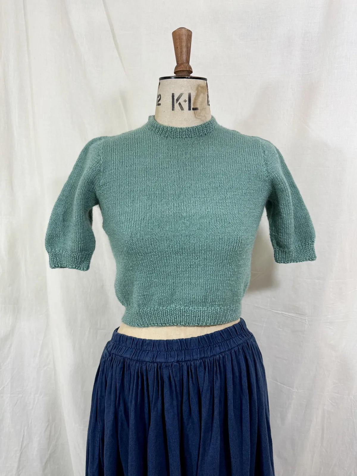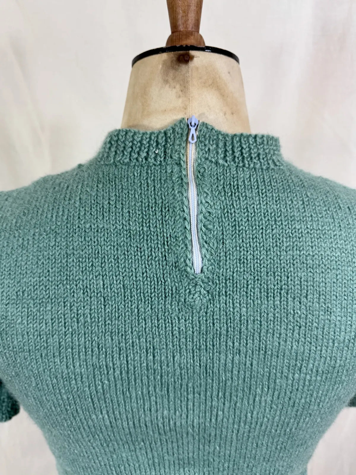 1940s hand knitted cropped jumper in peppermint green. Round collar, puff short sleeve. Zip fastening to back. Made from 100% wool. Lovely vintage condition.