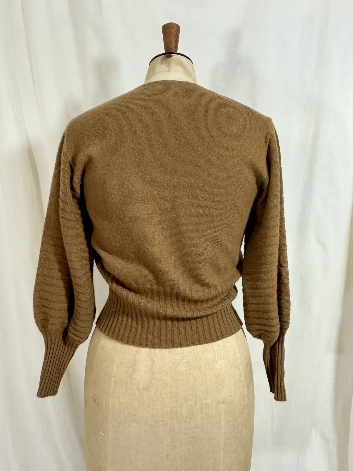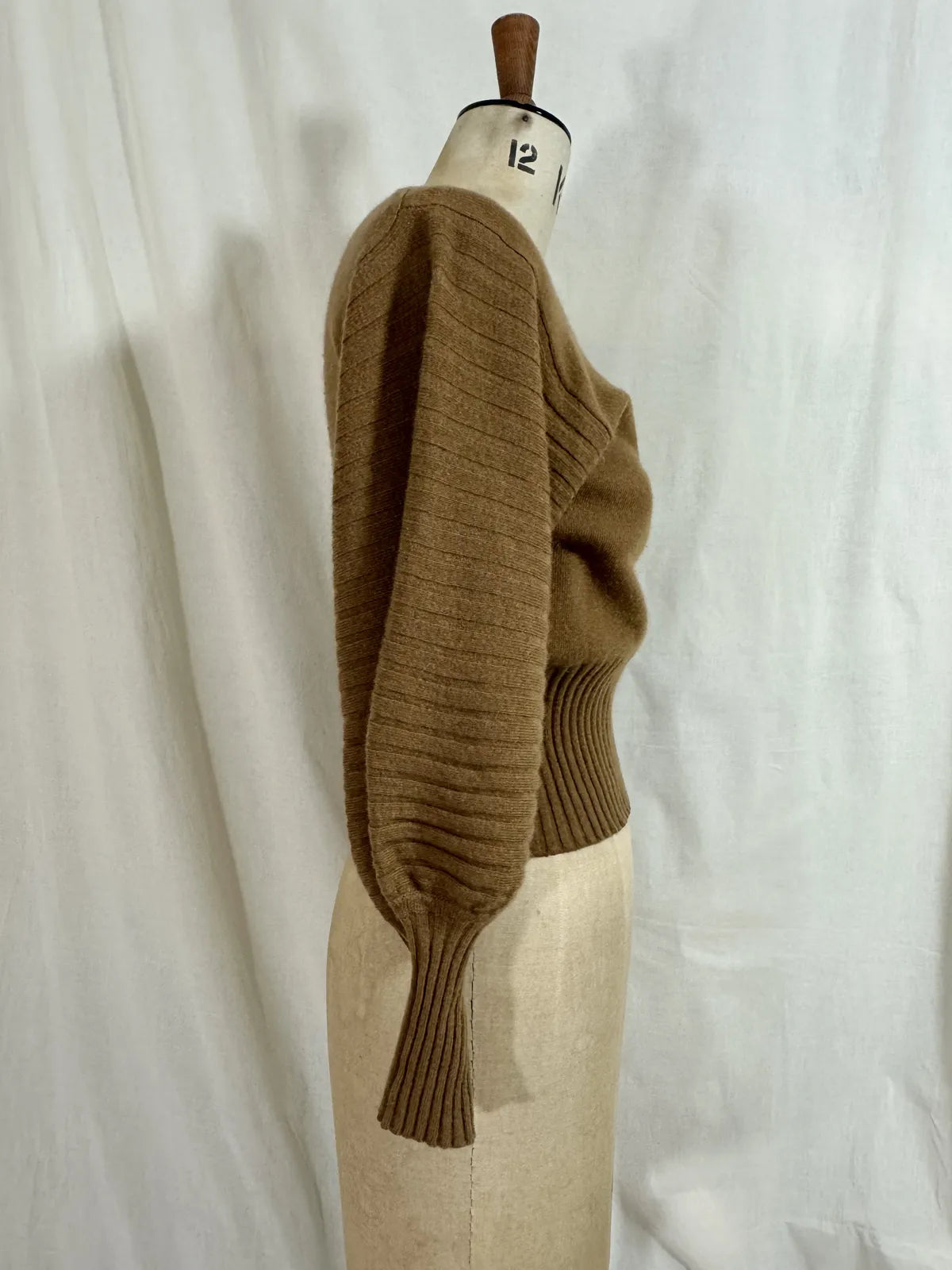 One for the collectors and sweater enthusiasts. Rare and iconic 100% cashmere sweater by Scottish born designer, Valerie Louthan. Valeries cashmere designs were at their height in the 1980s, this is an earlier example of her work dating back to early to mid 1970's. In a creamy caramel brown, this sweater moulds to your body perfectly, one of the more striking pieces of cashmere design I have seen. Square neckline, large leg of mutton sleeve with long fitted cuffs. An exquisite piece of textiles history. There are a couple tiny pinholes that have been repaired, which in no way deter from how incredible this sweater is. Label says Valerie Louthan for N. Peal of Burlington Arcade, London. 100% cashmere made in Scotland.